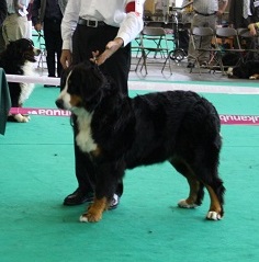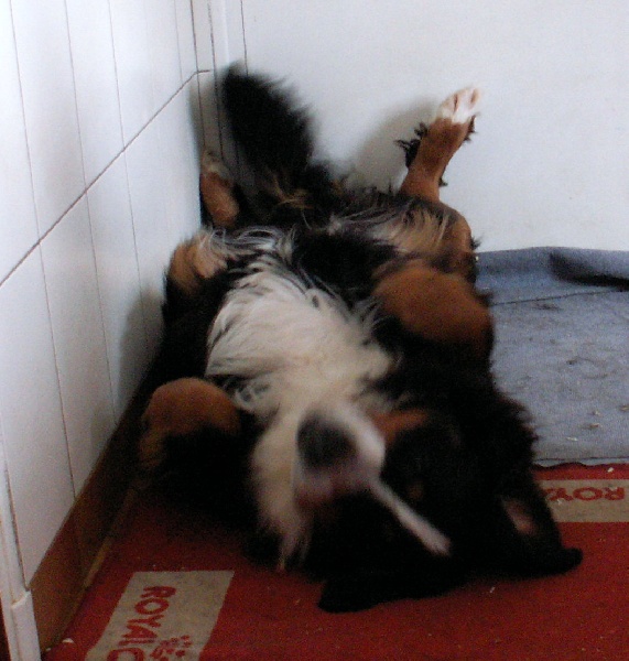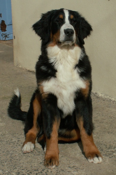 JEUNE CHIENNE DE BONNE CORPULENCE.DCC.LA TET ENCORE TRES ETROITE.LES ANGULATIONS SONT CORRECTES.EXCELLENTES REPARTITION DES COULEURS.DOS DOIT S'AFFERMIR.EXCELLENT CARACTERE.